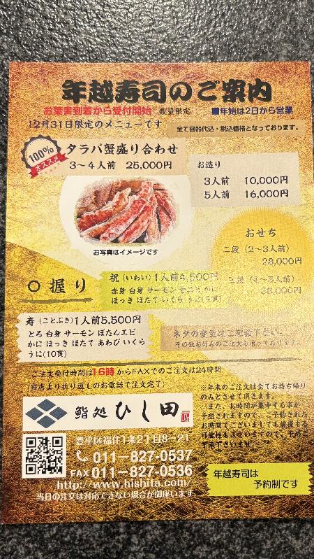 年末に向け、何かとお忙しくお過ごしのことと存じます。 今年の年越寿司についてのご案内になります。 毎年同様、握り、お造り、おせちの他にたらば蟹盛り合わせをご用意してお待ちしております。 当日のご注文には、対応しておりませんので、事前のご予約をよろしくお願い致します。 ご注文受付時間は16時〜21時となっております。FAXでのご注文をご希望のお客様に関しましては、24時間対応しております。 今年も精一杯お作りいたしますので何卒よろしくお願い致します。 |