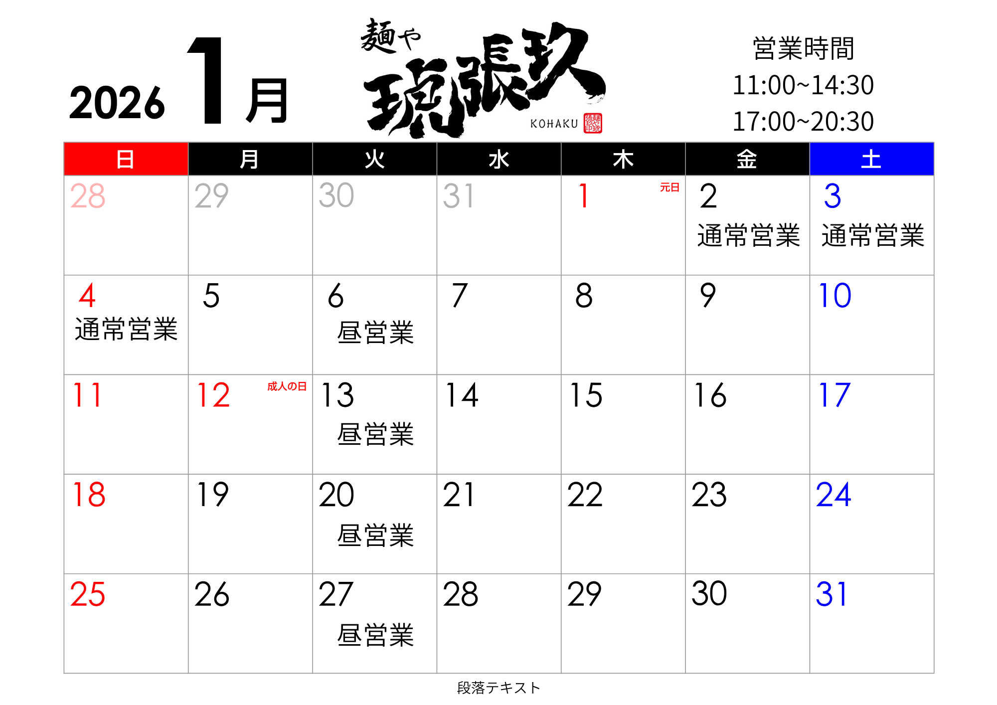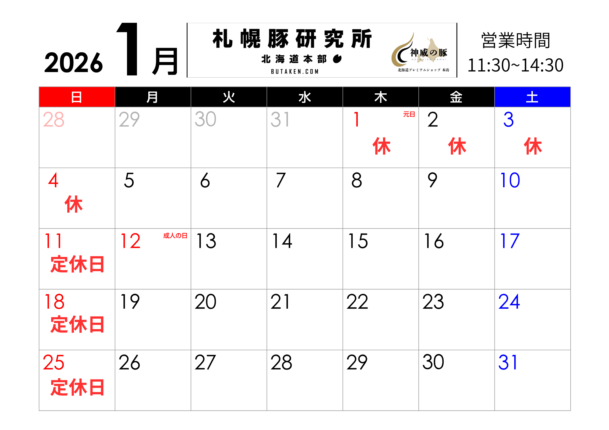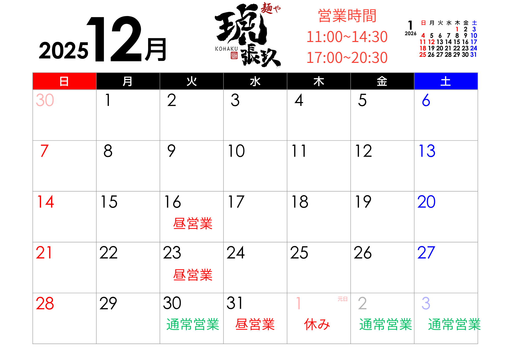 2026年度も、皆さまに愛されるお店を目指し 一層精進して参ります。 麺や 琥張玖 KOHAKU 厚別店 札幌豚研究所の1月の営業日程です。 宜しくお願いします。 |